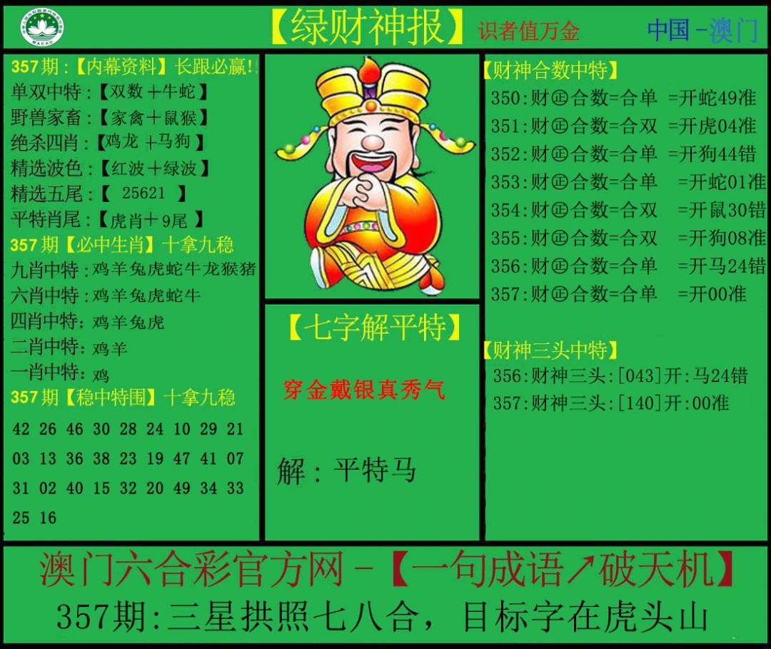 356期: 澳门六合皇彩圖信封【绿财神报】每期自动更新